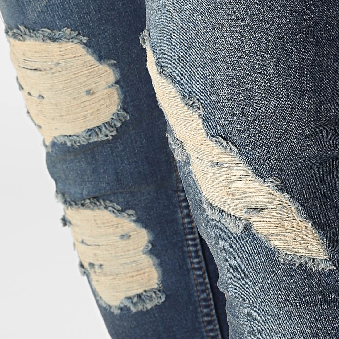 • Finition usée, délavée, avec rapiéçages et avec trous apparents